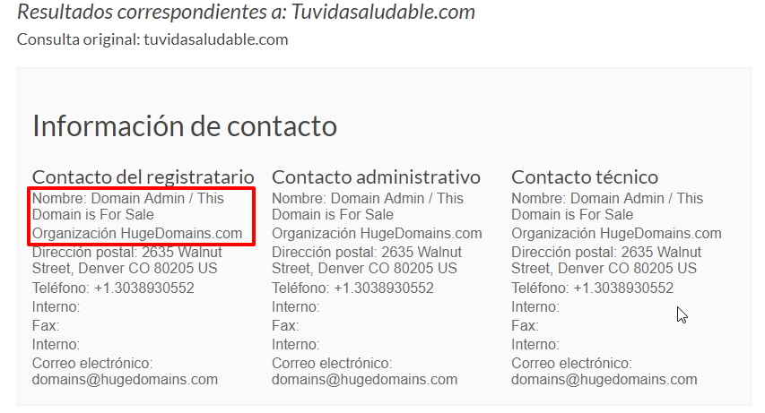 Como podemos observar el nombre propietario del Dominio es Hugedomains.com y además me indica que el dominio esta en venta. Por lo que se ha adquirido con objeto de especular con él.