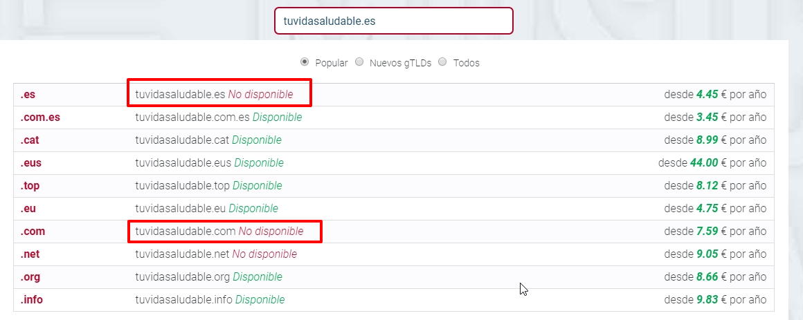 - El primer paso sería buscar en el registrador de dominios si las dos extensiones están disponibles: