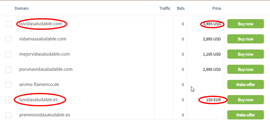 El precio del compra de tuvidasaludable.com alcanza una cifra desorbitada mientras que tuvidasaludable.es son 150 Euros, una cifra mucho más razonable.